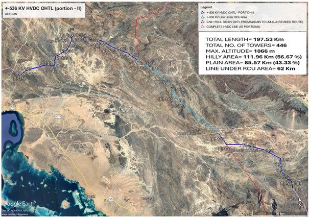 Über 55 % der Trasse (111,96 km) führen durch zerklüftetes, bergiges Gelände und erreichen Höhen von bis zu 1.066 Metern über dem Meeresspiegel. Die restlichen 85,57 km verlaufen durch ebene Landschaften. Ein besonderes Augenmerk lag auf den rund 62 Kilometern innerhalb der Schutzzone der Royal Commission for AlUla (RCU) – einer Region von einzigartiger landschaftlicher Schönheit und großer kultureller Bedeutung, die auch die UNESCO-Welterbestätte Hegra umfasst. Hier war höchste Sorgfalt im Hinblick auf Umweltauflagen, Denkmalschutz und behördliche Vorgaben gefragt. Insgesamt wurden 446 Masten installiert, um die anspruchsvollen topografischen und regulatorischen Rahmenbedingungen zu meistern.